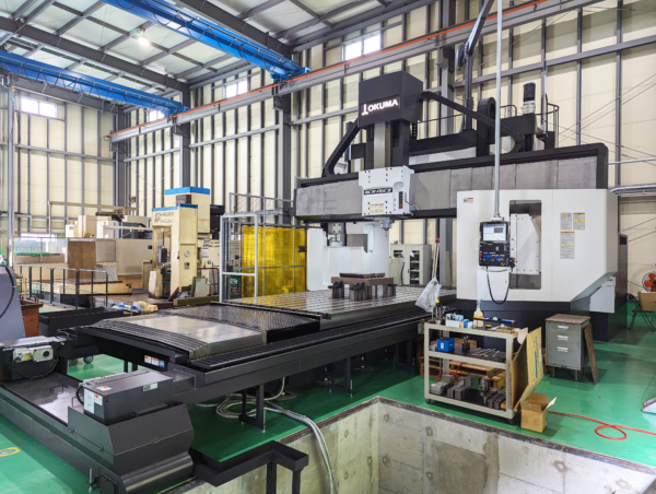 その構造上、高い剛性を持っており、重切削にも対応できるように設計されています。特に鋼材や厚板の切削、溶接構造物の仕上げ加工など、大きな切削力を必要とする工程で効果を発揮します。導入コストや設置スペースは大きくなりますが、サンメックのように大型門形マシニングセンタを保有する企業は限られており、大物加工に強みを発揮できる形式といえます。